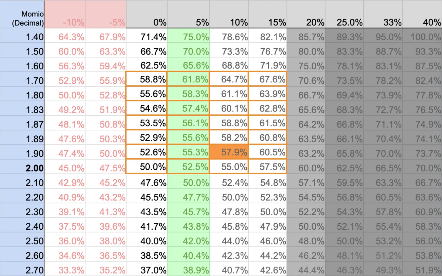 Las celdas naranjas (1.90 con 57.9% y 2.00 con 55.0%) son tu zona de strike.