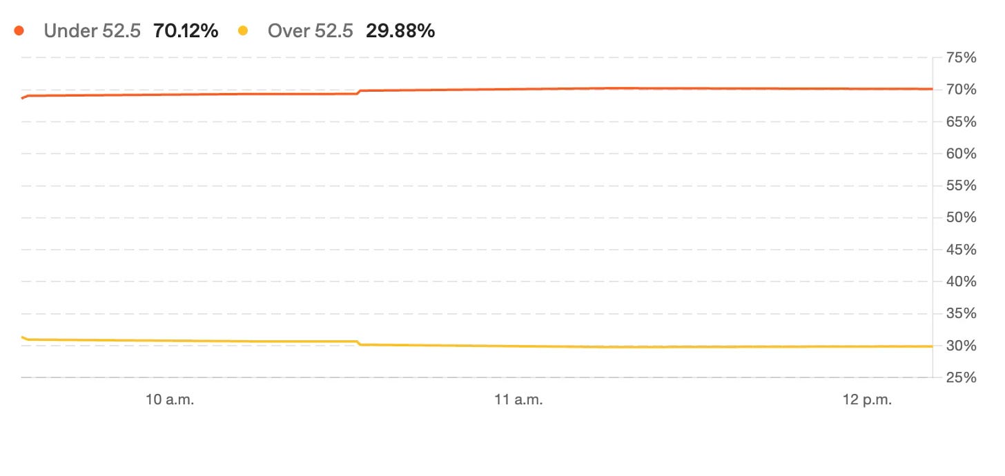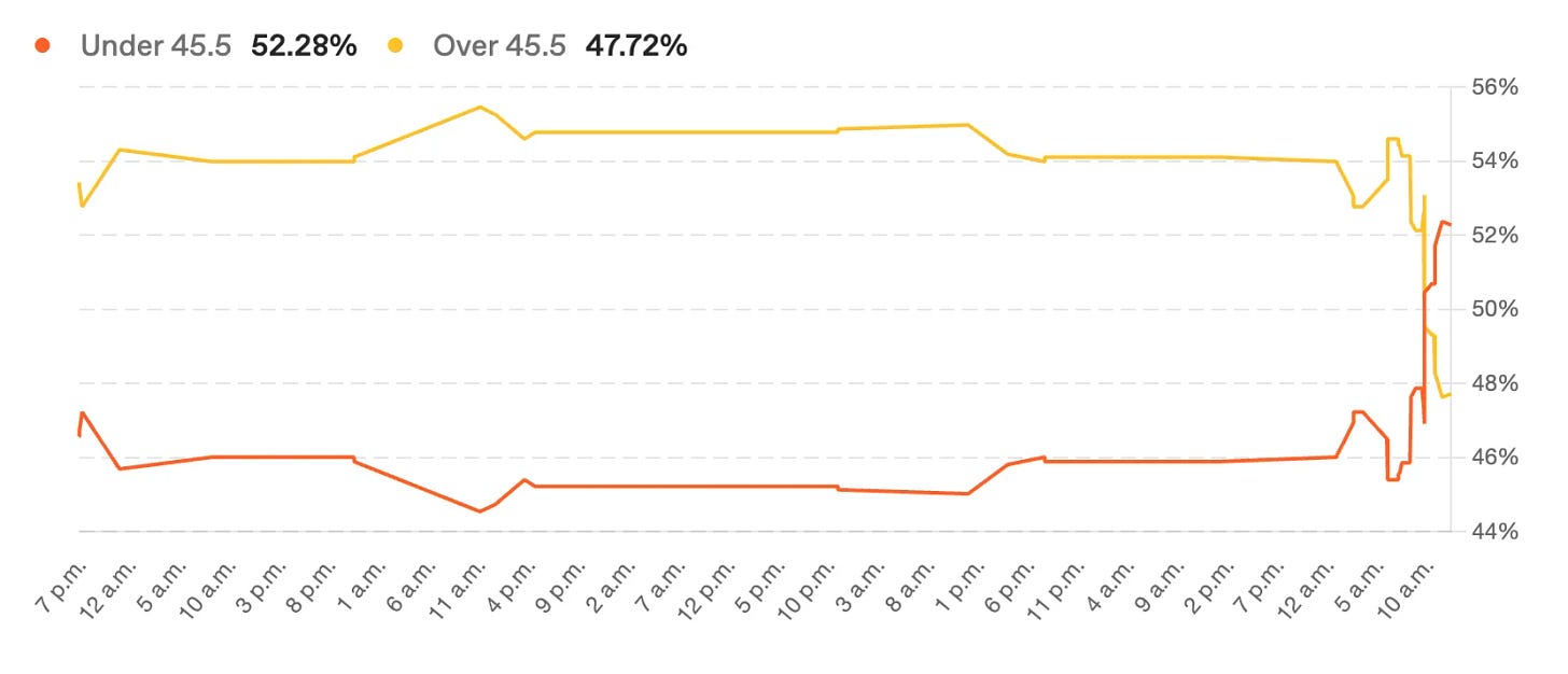 Totales: el under pesado domina en líneas altas (52.5 / 53.5), mientras que en 45–46.5 el mercado está más dividido