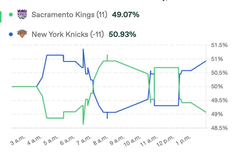 El mercado refleja una línea pesada a favor de NYK, inflada por la narrativa de recuperación. El público compra sin dudar, mientras que el dinero más serio se posiciona con Sacramento, tanto en spreads largos como en moneyline extendido. La clave está en lo que no se ve de inmediato: los Kings llegan con ritmo, confianza y motivación (posible vitrina de traspasos), y los Knicks tienden a bajar el ritmo cuando sienten el juego bajo control, abriendo espacio a una cobertura tardía.