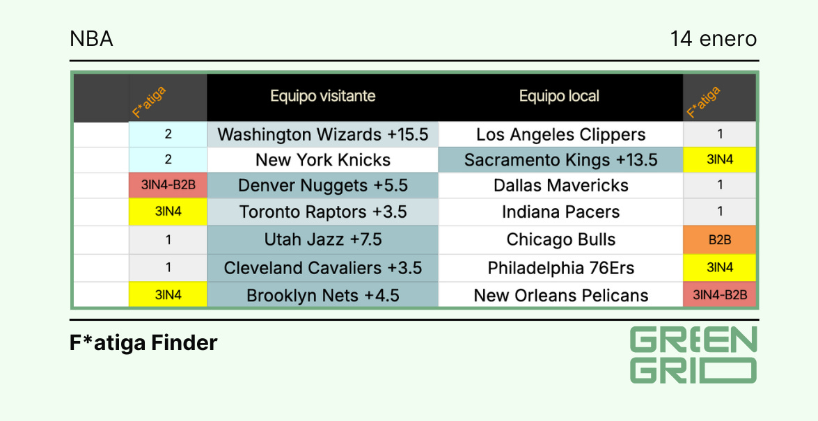 Un solo día de descanso para los Cavs, que visitan a unos Sixers en fatiga nivel 2 (3IN4). Cleveland está 8-9 en ruta, viene de perder y tiene marca neutral en sus últimos 10. Philadelphia, por su parte, 10-9 en casa, ganó el último y también está 6-4 en esa misma ventana.