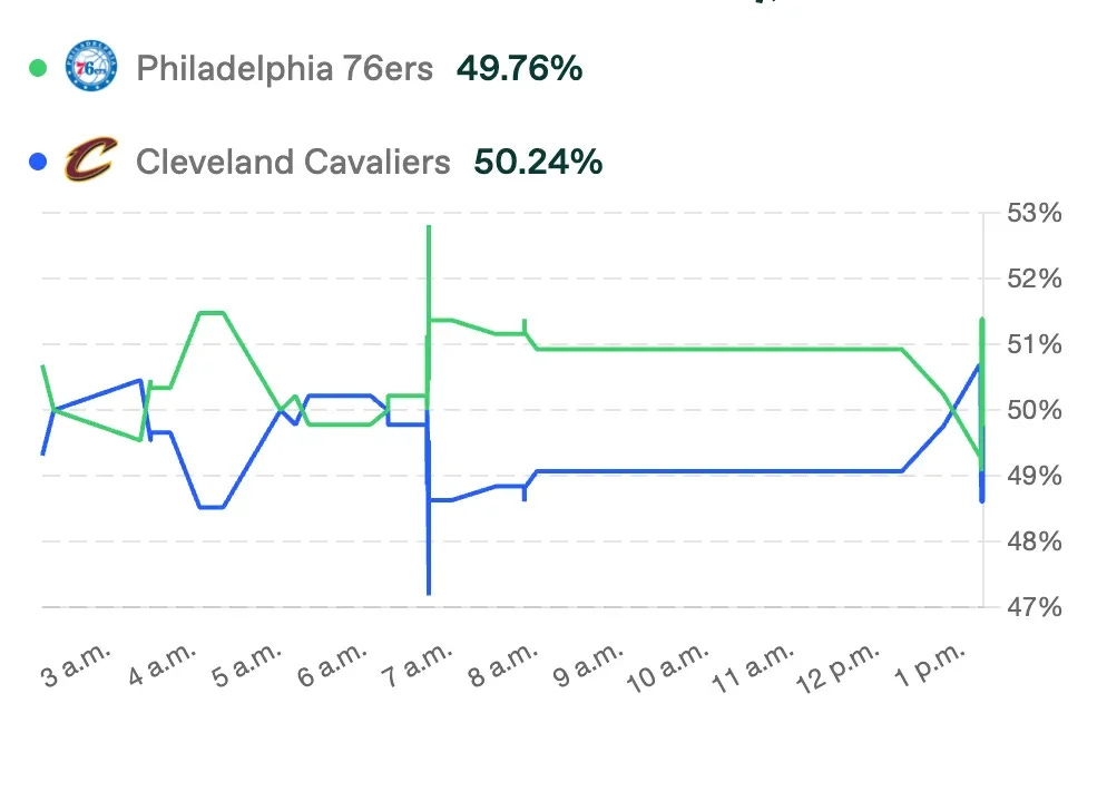 Lo que tenemos aquí es un cruce más físico que vistoso, con una lectura de mercado que huele a volado disfrazado. Los Sixers son levemente favoritos por localía, pero llegan cargados y tocados, mientras que Cleveland, aunque irregular fuera de casa, trae piernas frescas. Los splits muestran que el dinero más serio se alinea con Cleveland al spread, mientras que el público se va con Philly por nombre y narrativa reciente.