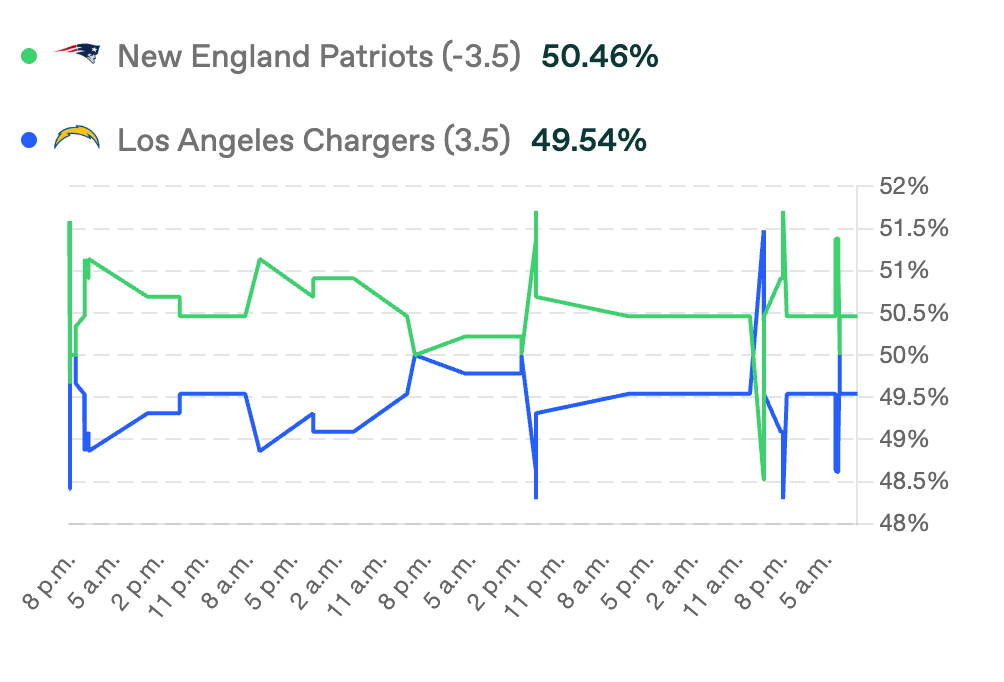 el mercado no encontró una narrativa clara, y lo reflejó con un casi empate técnico entre Patriots (-3.5) y Chargers (+3.5).