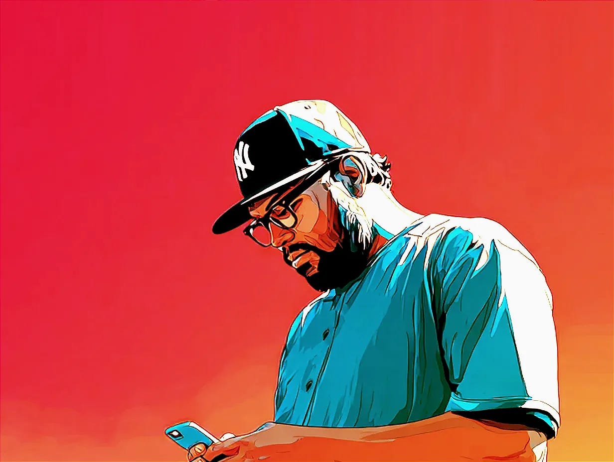 Gordo, gorra de Yankees, hablando solo por el auricular: